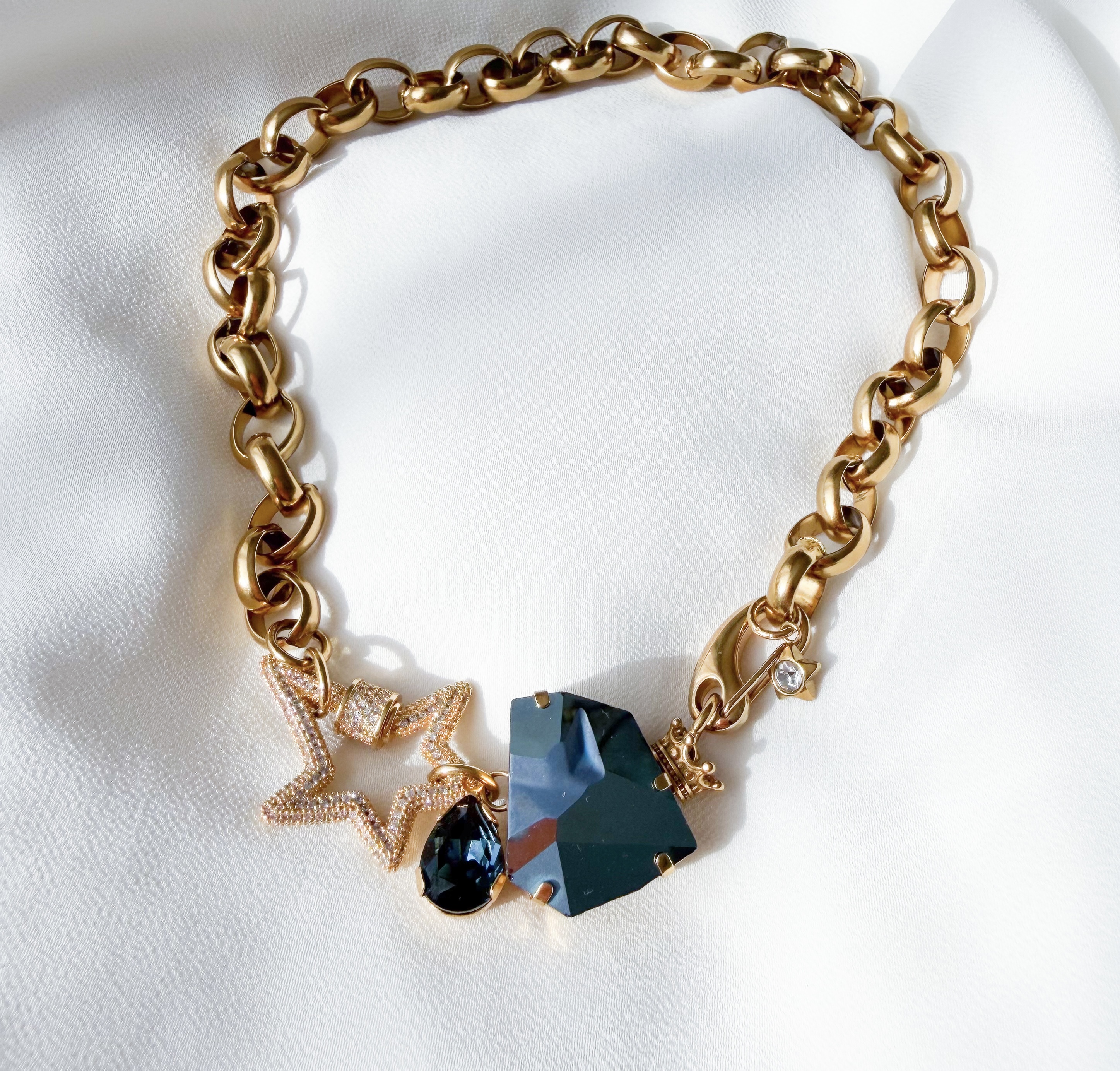 Primero kristalai ir Cirkonio akutėmis, nerūdijančio plieno (stambaus rašto) grandinėle